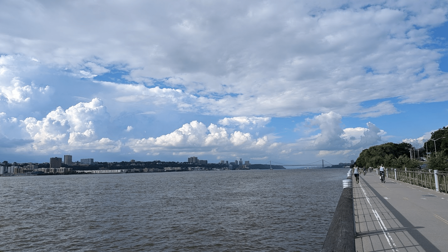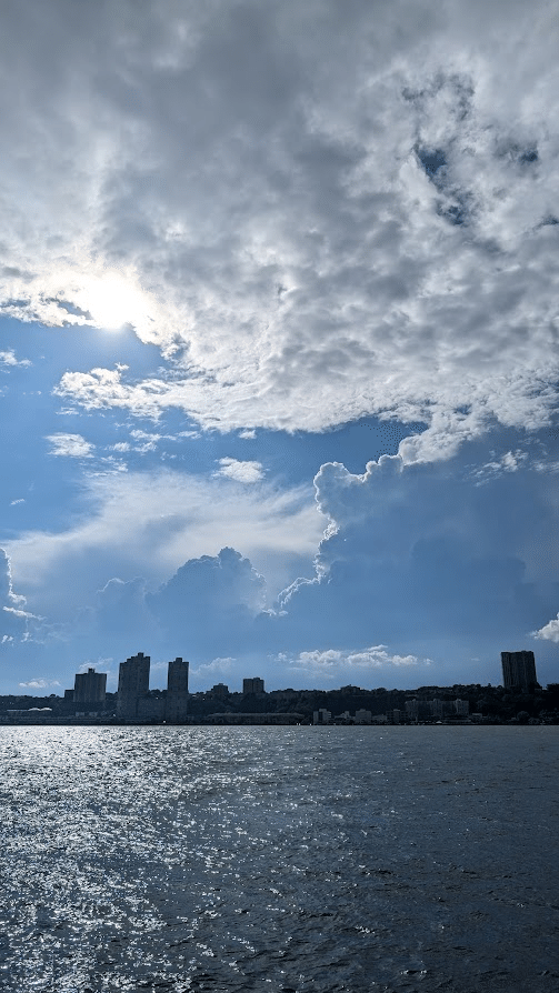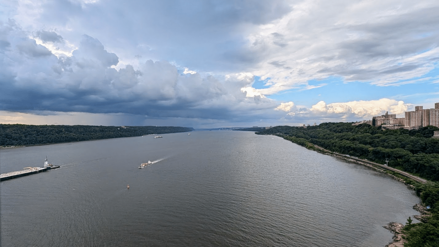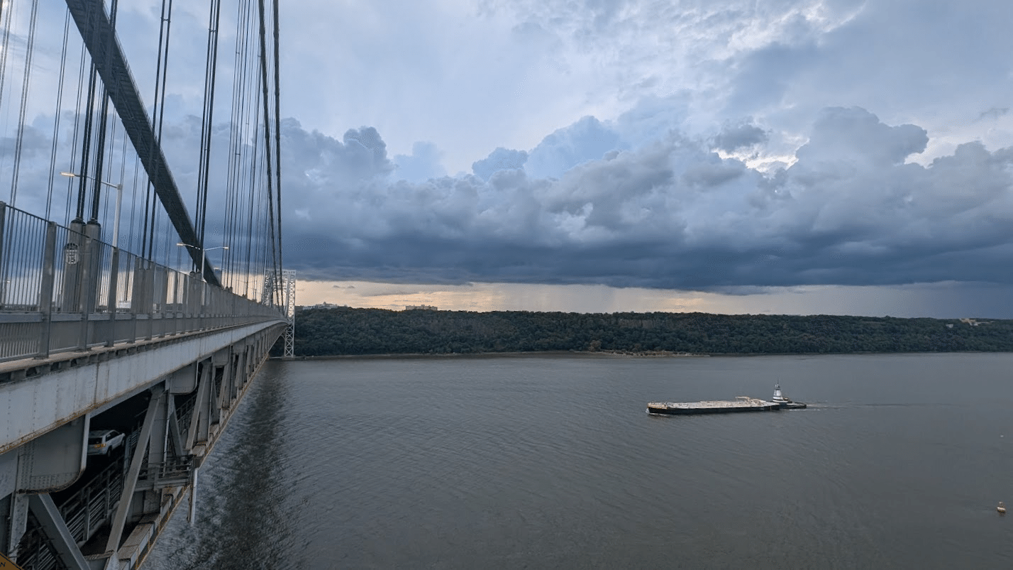 ジョージワシントンブリッジに差し掛かって驚いたのはハドソンリバーの東と西で天気がくっきり分かれていること。右(東)のマンハッタン川は晴れて光が差してますが、西のニュージャージー側は雨雲が暗い影を落としています。