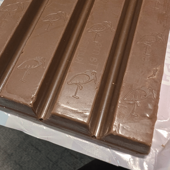 ちなみにネットの記事でもパチモンじゃないかという疑問が呈されていましたが、キットカットはKit Katの文字がチョコ表面に彫り込まれているのに対し、KVIKK LUNSJはコウノトリが彫られているということでした。
